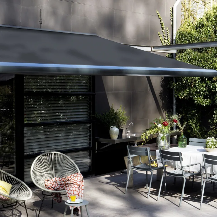 Stem de kleur af op de buitenkant van je huis, de kleur van de stenen muur of je tuinset, jij bepaalt wat past bij de buitenkant van je woning. En je hoeft niet meer weg te branden in de zon. Geniet overdag lekker onder jouw knikarmscherm, waar je in de schaduw kunt zitten en je ’s avonds iets meer beschut je wijntje kan weg nippen.
