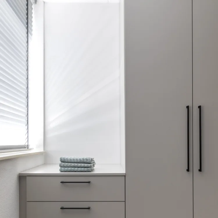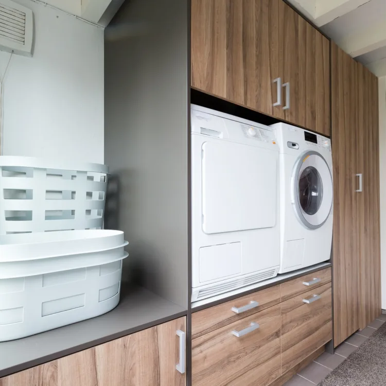 In de kast zitten uitsparingen voor de wasmachine en droger, en in de kasten eromheen kun je alles kwijt wat nu rond slingert. Een ander voordeel van de wasmachinekast op maat is dat de machines op ooghoogte staan en onder de machines handige uittrekplanken zitten waar je de wasmand op kunt plaatsen. Hierdoor hoef je niet meer te bukken bij het doen van de was!