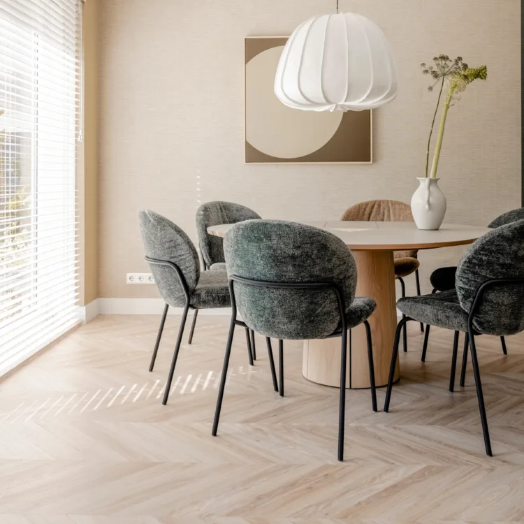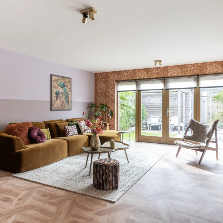 Houten jaloezieën die zorgen voor privacy en een warme, natuurlijke look in de woonkamer.