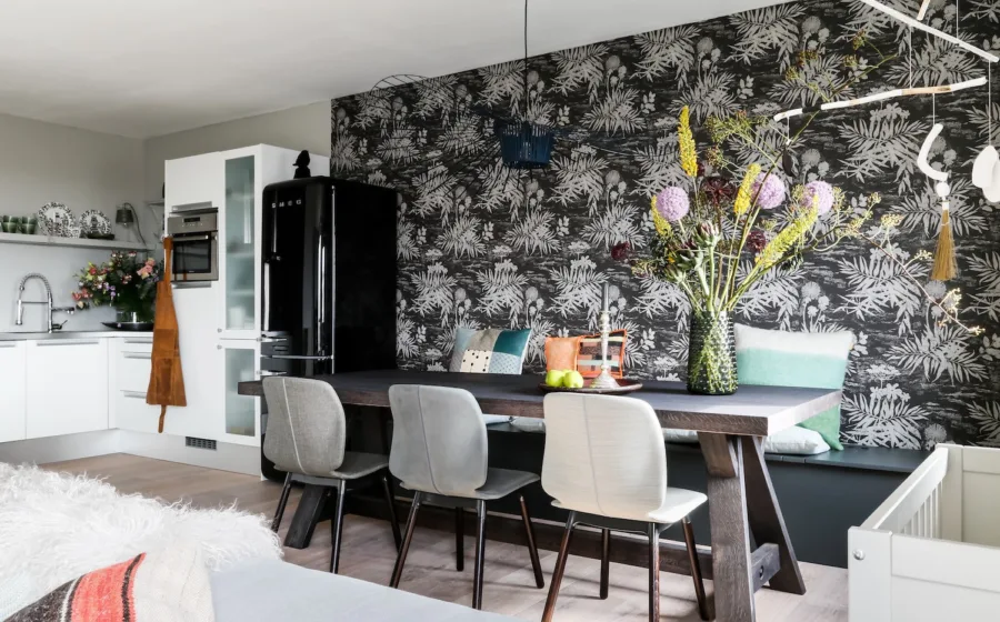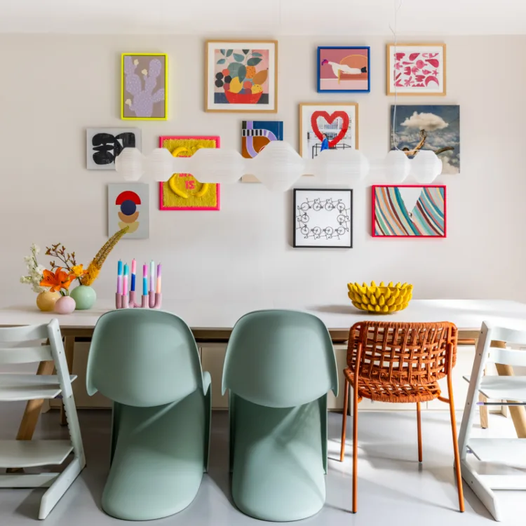 Warmte krijg je gelijk door een houtlook vloer in een donkere tint. Verder ben je goed op weg als je alles in kleur kiest qua woninginrichting. Een vloerkleed met een rood/paarse print, gele dupligordijnen en knalblauwe gordijnen. Op de muren ga je voor bijpassende kleuren en de accessoires houd je rustig.