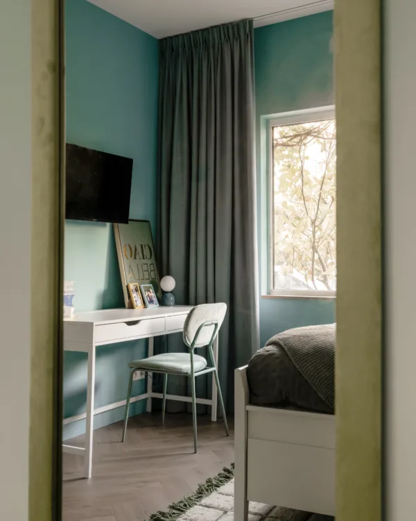 De frisse mix van groen- en blauwtinten geeft de ruimte een speelse, maar toch rustige uitstraling. Om het helemaal af te maken, hangen er prachtige verduisteringsgordijnen van Aanhuis.nl in een mooie blauwtint. Perfect om lekker uit te slapen, een filmavondje te houden of gewoon even weg te kruipen in haar blauwe bubbel.