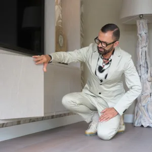 De bewoners willen in hun woonkamer genieten van een grote tv waar ze al hun favoriete films en series op kunnen kijken. Gelukkig heeft Frans ook hier een stijlvolle oplossing voor: een prachtige Cinewall op maat waarin de tv naadloos past. Natuurlijk in de kleur Zandsteen, die perfect in het kleurenpalet past! En het unieke aan deze kast? Het schitterende Arte Botanic Linen behang, dat ook achter de bank hangt, is verwerkt in de Cinewall. Zo ontstaat er een speels en modern geheel.
