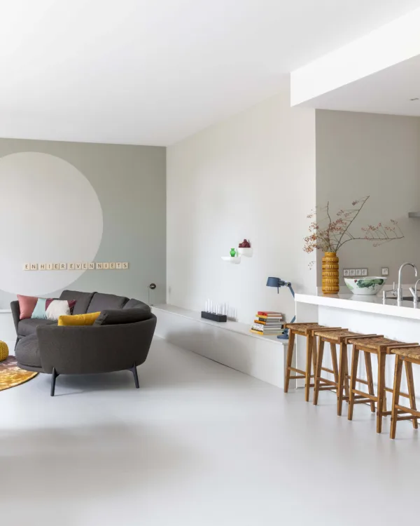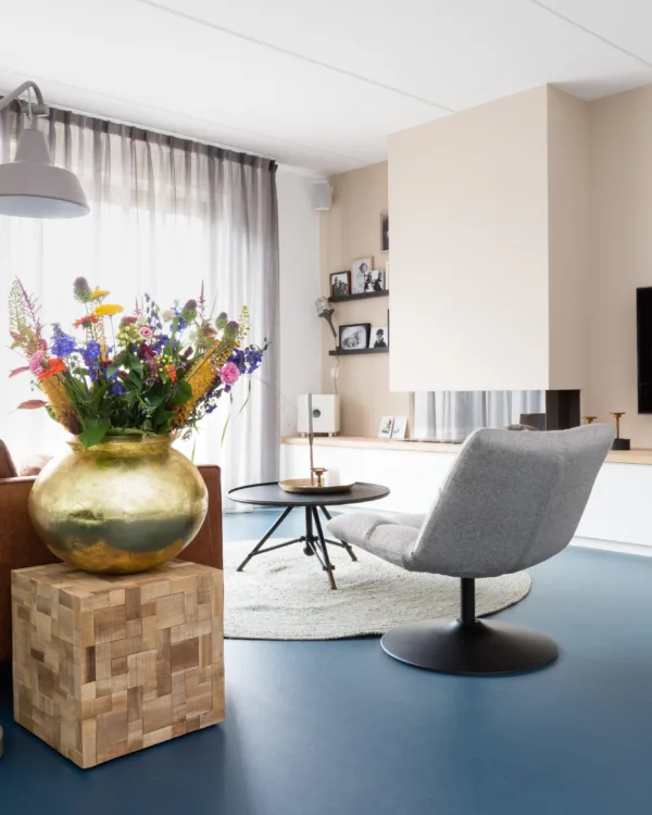Japandi woonkamer met bruintint marmoleum vloer