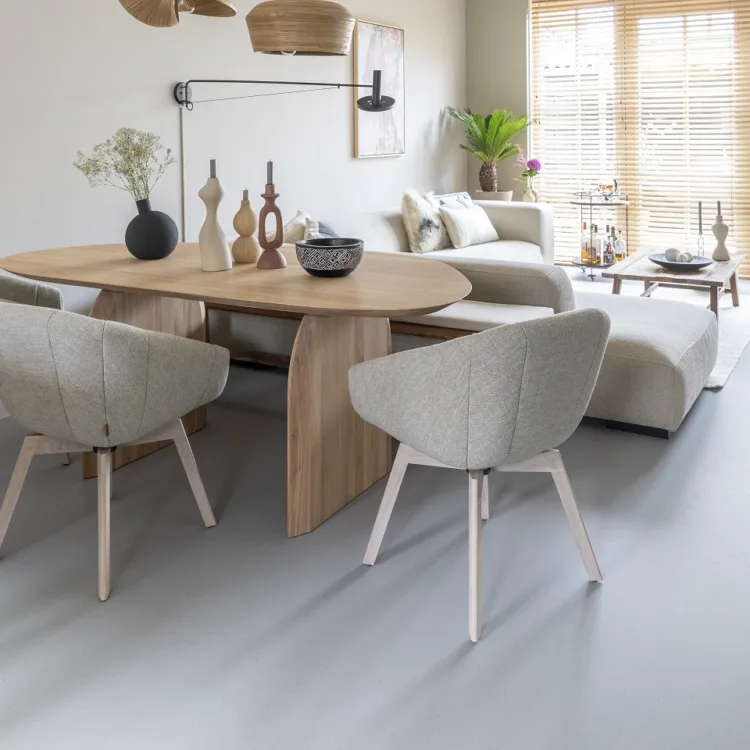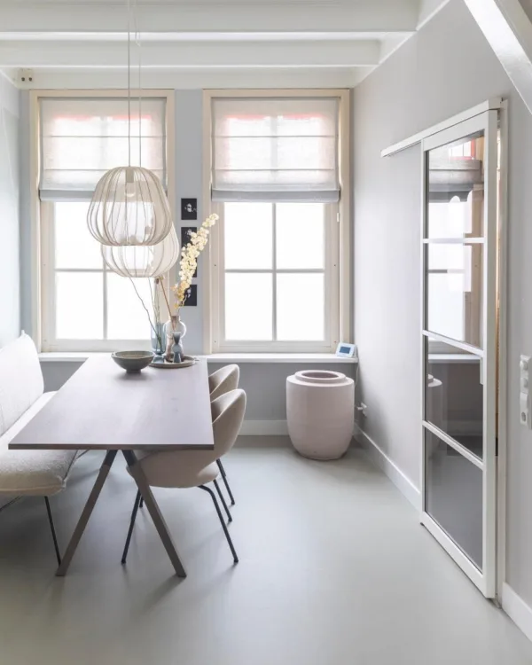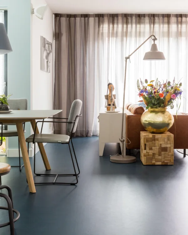 Bruintint marmoleum vloer in de eethoek