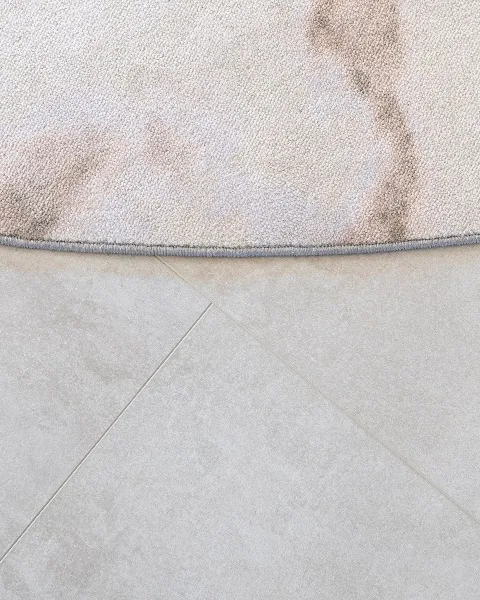 Goed idee: een gekleurd kleed op een effen pvc tegel vloer.