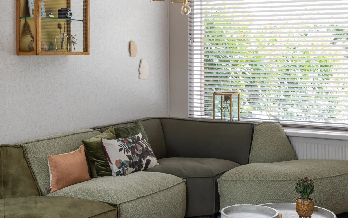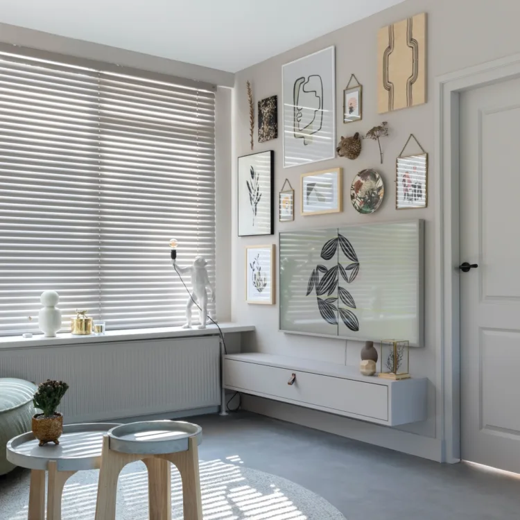 De Luxaflex® jaloezieën in de lichte kleur laten het licht heerlijk binnen. Het geeft je de privacy die je nodig hebt, maar ook voldoende licht. Televisiekijken gaat met gemak als je ze dichtdoet en stiekem naar buiten kijken kan als je ze heel iets openzet. Hetzelfde geldt voor in de keuken, want daar hangen ze ook. Een geheel plaatje als het gaat om raamdecoratie. De iets bredere lamellen maken de jaloezieën stoer en op die manier passend bij zowel de stijl van Valentin met de zachtheid van kleur voor de stijl van Marlijn.