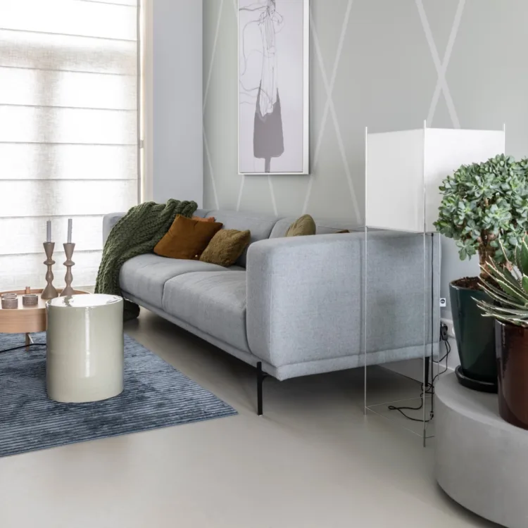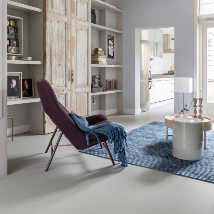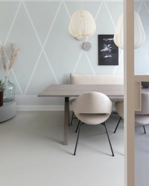 Wederom zijn wij weer de schepper van de basis, vloer. Ditmaal in een strakke versie voor een ondergrond die 'clean' is, zoals Hans het graag ziet. Het gaat om de betonlook Marmoleum vloer van Forbo in click variant in de kleur Orbit. Deze qua kleur en structuur strakke vloer is 100% natuurlijk en hiermee zo duurzaam als maar kan. Daarnaast heeft de lichte kleur een groot voordeel voor het kleine huis; het lijkt namelijk een stuk groter. Zeker doordat Marianne de vloer heeft laten doorleggen in de keuken. Zo heb je meer eenheid en ruimtelijkheid in de kamer.