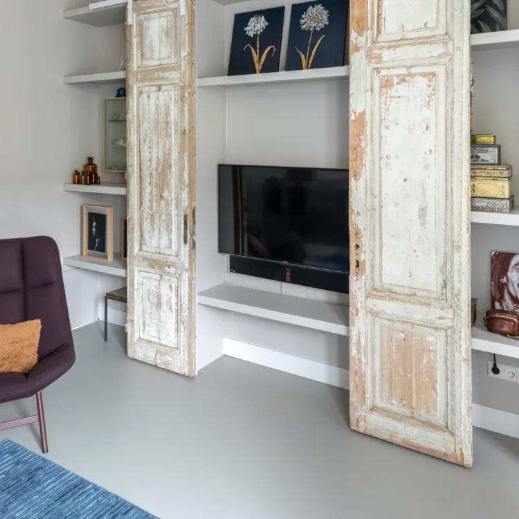 Bekijk onze vouwgordijnenOnder de basis, de strakke betonlook Marmoleum vloer, ligt elektrische vloerverwarming. Ideaal in het kleine huis van Karin & Hans. De foliematten geven geleidelijke en egale warmte af. Voordelen hiervan is dat je minder gas verbruikt én je hebt die lelijke radiotoren niet meer. Handigheidje; je kan de verwarming bedienen met je smartphone. Zeker het overwegen waard als je toe bent aan een nieuwe vloer.