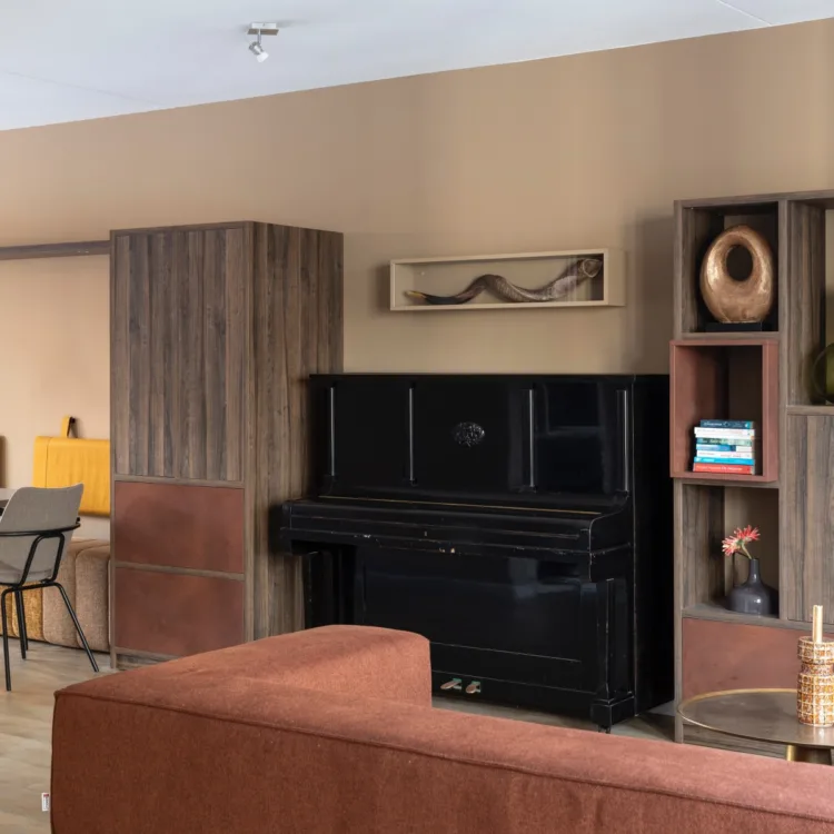 In de kast is bij de kant van de keuken de koelkast en de vriezer verwerkt. Daarnaast een bankje voor de eethoek, de piano staat ertussen en tot slot is het een luxe tv meubel. Een combinatie van draaideuren met open vakken.