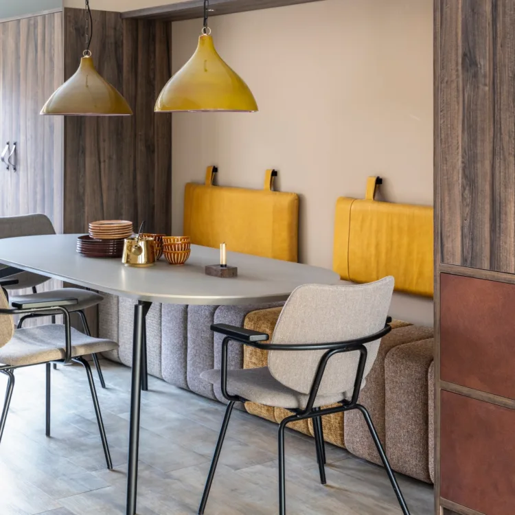 De kleuren van de kast heeft Fietje zelf samengesteld. De kubussen zijn in de kleur Lime Earth Baked F256 en de verdere donkere kasten in de kleur Sable LR81. In de wandplank van de eethoek zijn wandspots verwerkt die met een afstandsbediening dimbaar zijn. De draaideuren en lades zijn soft close, die kan je gewoon dichtgooien zonder kabaal ;-)