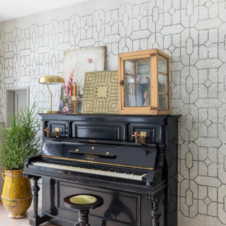 Marianne heeft voor de stijl Modern Romance gekomen. En dat zie je terug in de rustige kleuren op de muur (Saliegroen van Flexa) in combinatie met het grafische behang (Eijffinger) met hier en daar romantiek door de diverse prints in het huis. Rust, door het niet op alle plaatsen druk te maken, alleen op de plekjes van Fleurie zoals op de piano. Frisheid door licht kleurgebruik zoals de raambekleding, onze plissés van de Aanhuis collectie, zijn licht waardoor de woonkamer en het kantoor een stuk lichter is. Met de top down-buttom up functie van de plissés bepaal je zelf hoeveel licht ernaar binnen mag vallen. Een praktische en slimme oplossing voor in de woon- en werkkamer. Een beetje vernieuwing heeft Marianne toegevoegd door de moderne vormen van de banken en het toevoegen van de stalen schuifdeur (Gewoon Gers) voor hun eigen werkplek.
