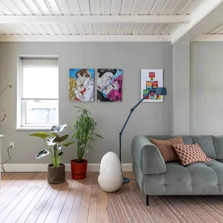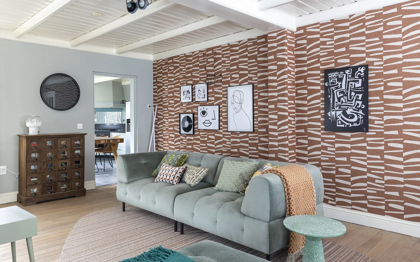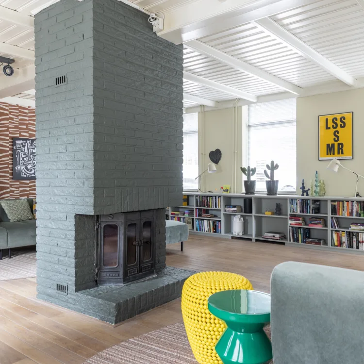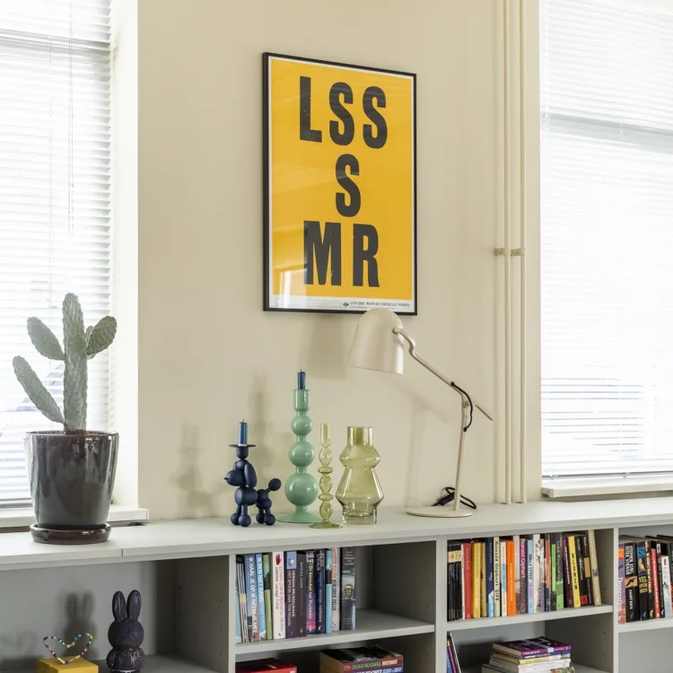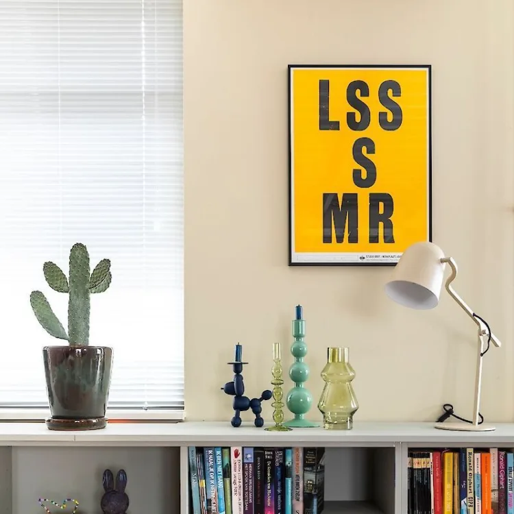 Rust, ruimte met een aparte twist, daar draait het om in deze woonkamer. En hoe te gek zijn al die cartooneske posters en kleuren? Ik vind ze fantastisch! Om de rust te houden en de aandacht op al die mooie pasteltinten te houden heeft Fietje gekozen voor neutrale raamdecoratie.