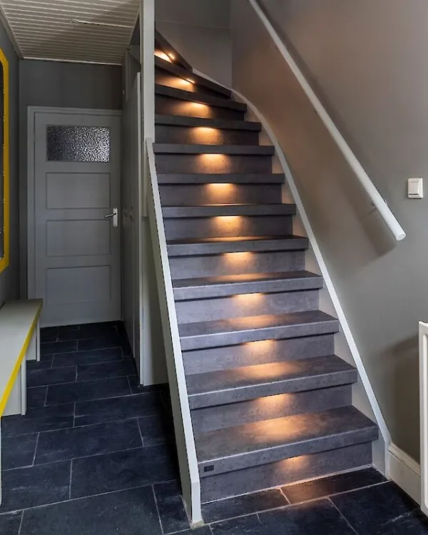 Naast die geweldige IXXI’s heeft de hal een prachtige make-over ondergaan. Kijk die trap eens stralen! Ja, letterlijk! Door de ingebouwde LED verlichting zie je ‘s avonds waar je loopt wat de trap een stuk veiliger maakt, ook voor de kinderen. Ook is de trap bekleedt in een strakke betonlook. De leuning is dan weer geschilderd in dezelfde kleur als de muur, wat zorgt voor rust.