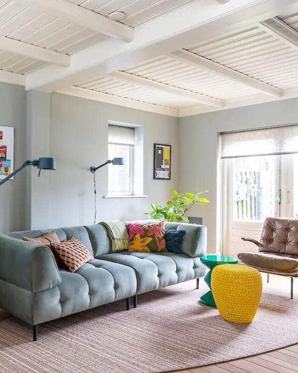Zo hangt er een combinatie van twee verschillende soorten raamdecoratie om het speels te houden. Aan de ene kant van de kamer hangen namelijk semi-transparante rolgordijnen in een lichtgrijze kleur die goed passen bij de licht grijze kleur op de muur. Doordat de stof niet verduisterd behoudt je lekker veel licht in de woonkamer. Dit creëert een ruimtelijk gevoel.