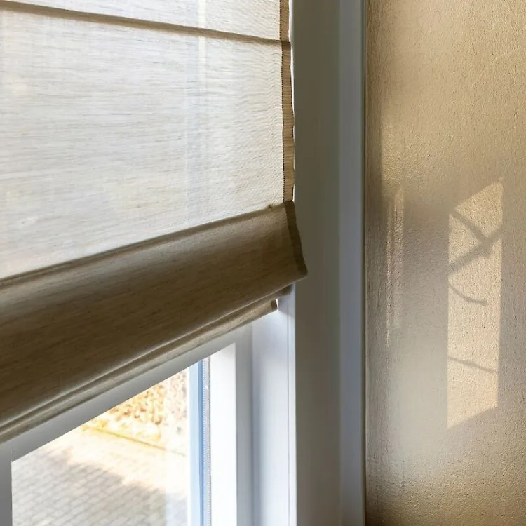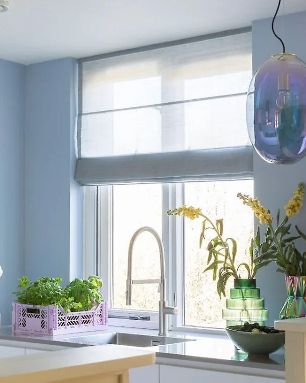 Ook de vouwgordijnen in de keuken komen van De Ploeg. Hier heeft Marianne ervoor gekozen om dezelfde duurzame stof te gebruiken als de voiles in de woonkamer, maar om de keuken een aparte ruimte te doen laten lijken, hebben deze een andere kleur dan de vouwgordijnen in het eetgedeelte. Deze deelt dezelfde kleur 06 als de voiles, maar in de keuken is besloten voor een lichtblauwe kleur 44.