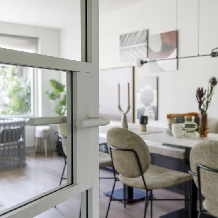 Eva is goed van start gegaan en heeft gekozen voor veel lichte tinten, waaronder lichtgeel, groen en beige voor een warme touch. Deze kleuren laat ze terug komen in verschillende materialen en stoffen, waardoor er een speels karakter wordt toegevoegd. Deze lichte kleuren staan heel gaaf bij de stalen deuren in de kamer! Je komt hier namelijk niet alleen de woonkamer binnen met een gave stalen deur; ook de voorraadkast is voorzien van zo'n stoere deur.
