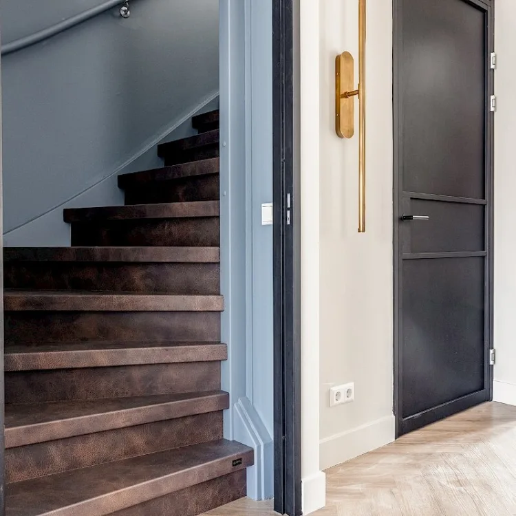 Een pvc vloer is een hele veilige basis en gemakkelijk in gebruik. Krasbestendig, bestand tegen water, eenvoudig schoon te maken en de keuze in kleuren en dessins is groot. Je kan kiezen voor onder meer een betonlook of een houtlook vloer. Kies je dat laatste dan kan je ook nog een brede visgraat laten leggen. Heel mooi wanneer je ervoor kiest om dat over de hele benedenverdieping door te laten lopen, zoals hier in IJmuiden.