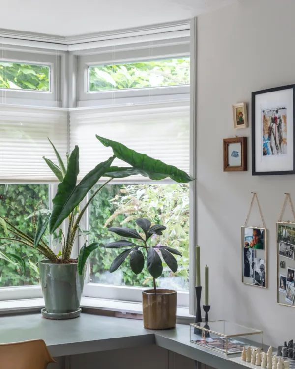 Door de top down en bottom up bediening van de plissés kan je zelfs je gordijnen in het midden van je raam laten hangen. Licht kan dan van boven- én onderaf je kamer in. Heel mooi; wel licht in huis, geen inkijk! En echt passend in het geheel. Wel privacy, maar niet overheersend aanwezig.