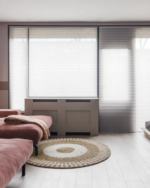 Fietje kiest voor plisségordijnen van BeCe aan de voorkant en achterkant van het huis. Plissés hebben een honingraatstructuur. Het materiaal voelt bamboe, rietachtig aan en dat geeft een natuurlijke uitstraling.