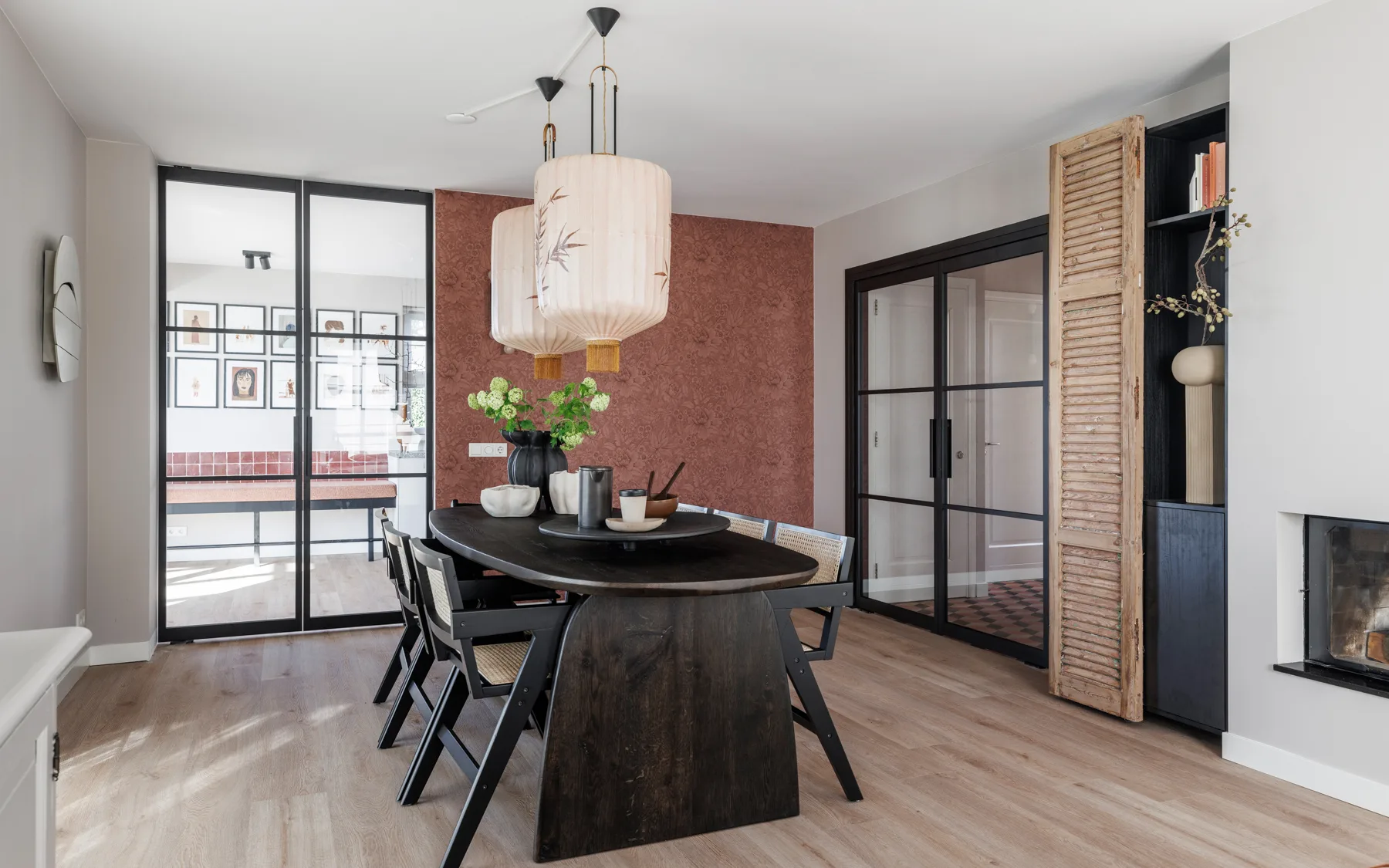 Moods is een gedurfde collectie door de diamantvormen in verschillende kleuren. Zoals je ziet met warm roze, zwart en de lichte houtlook die voor de goede aansluiting met de rest van de benedenverdieping zorgt. De overgang van hal naar woonkamer is hierdoor geen enkel probleem.