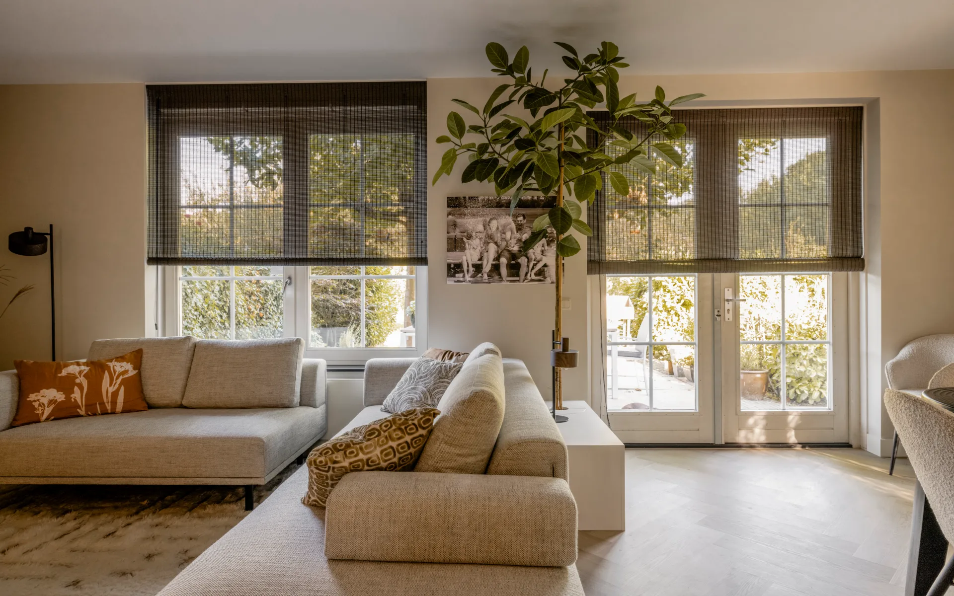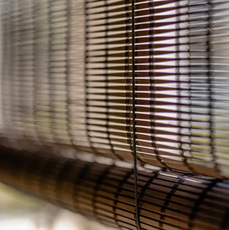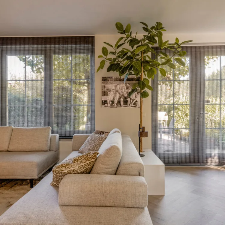 Daar waar Wendy van natuurlijke materialen houdt en Jaap een voorliefde voor donkere kleuren heeft, is dit DE oplossing voor hun ramen. Want in alle vertrekken, woonkamer, eetkamer én keuken hangen wij dezelfde geweven hout rolgordijnen in de kleur 7338. Een super trendy en hippe vorm van raamdecoratie. Ingemeten en gemonteerd door de vakmensen van Aanhuis.nl.