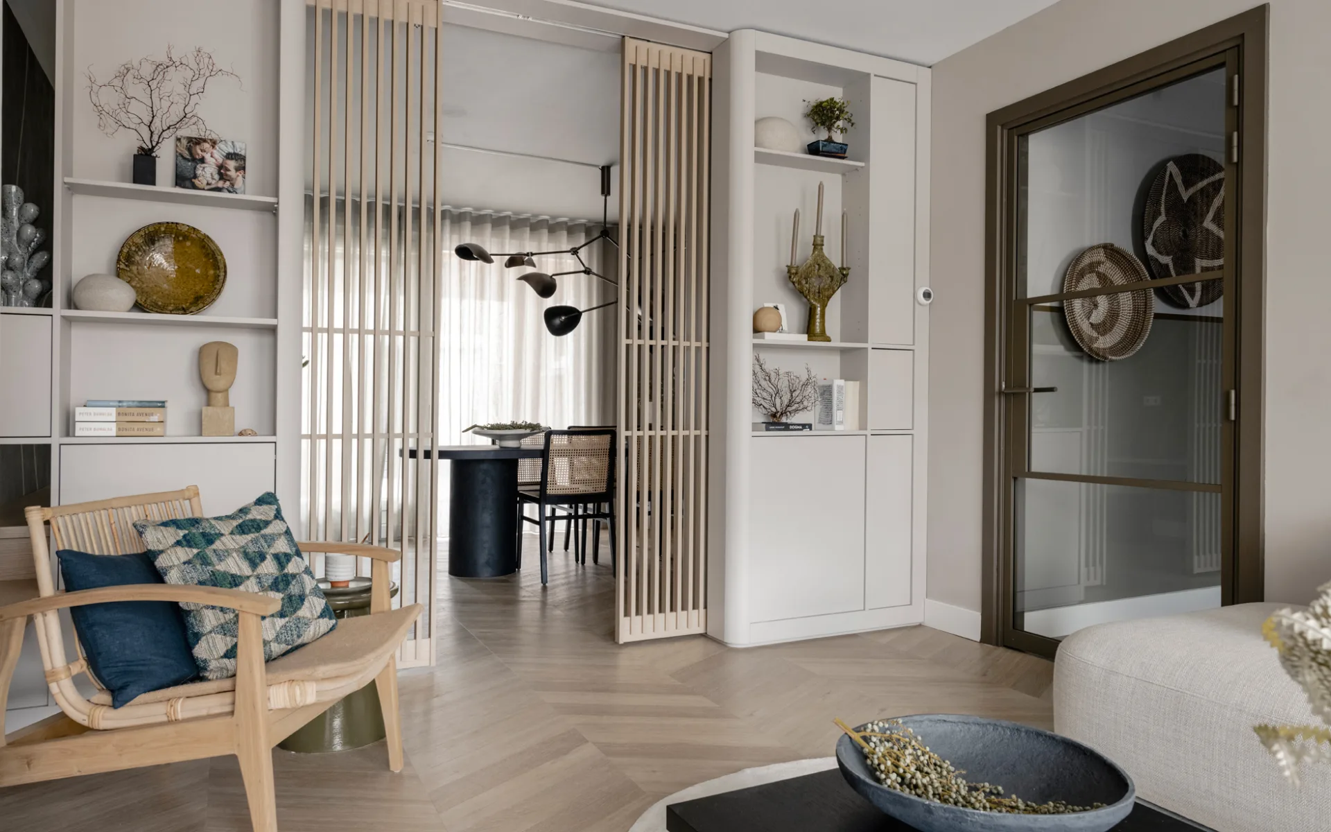 Ook de raamdecoratie kon wel een make-over gebruiken. Liza heeft, door te kiezen voor vouwgordijnen in een lichte tint, eenheid en warmte gecreëerd. Aan de voorkant van de woning heeft Aanhuis.nl elegante vouwgordijnen van Luxaflex® geïnstalleerd, in de kleur nr. 9905. Dezelfde stof komt terug aan de achterkant van de woning, bij de openslaande deuren, maar dan in moderne wavegordijnen. Door voor dezelfde stof, maar dan in verschillende gordijnen te kiezen, ontstaat er rust mét een speelse touch!