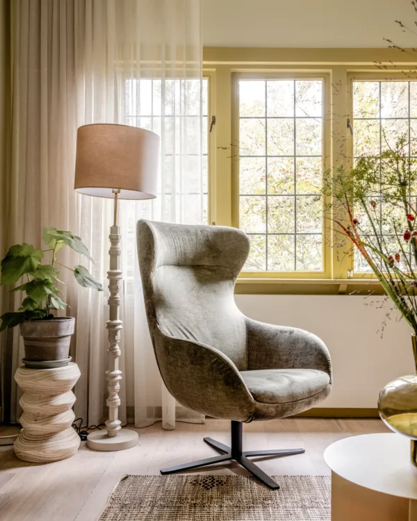 Geen huis is af zonder iets voor de ramen. In de woonkamer hangen wij daarom vitrages met een hele mooie luchtige waveplooi. Deze ultra dunne gordijnen zijn uit onze Aanhuis-collectie, stof Parijs in de kleur Canvas.