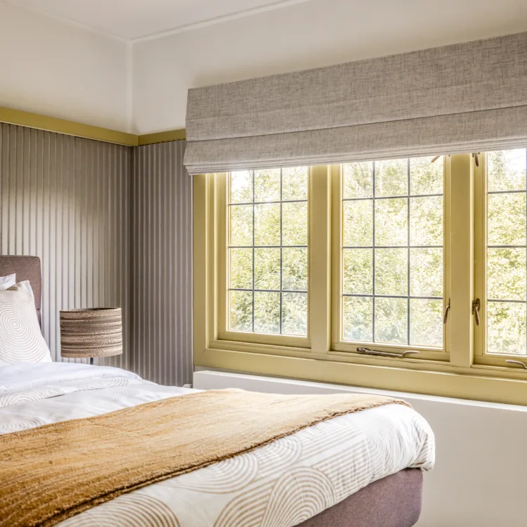 In de slaapkamer komen dezelfde vouwgordijnen maar dan verduisterend gevoerd. Dat slaapt wel zo lekker, als je slaapkamer goed donker verduisterd wordt.
