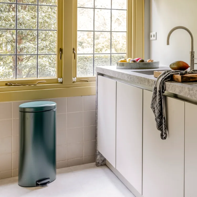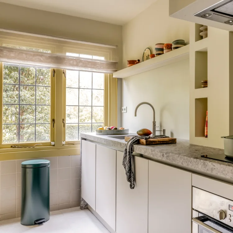 In de keuken hangen we vouwgordijnen in dezelfde stof. Mooi en eenvoudig. Passend bij de luchtige look waar Fleur blij van wordt en toch ook stoer wat bij Ocke past.