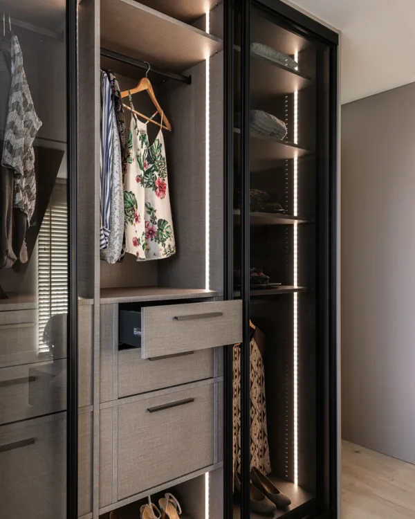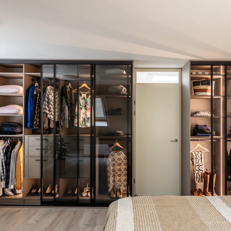 Door te kiezen voor rookglas in de schuifdeuren is alles nog steeds goed zichtbaar, maar creëert Frans een stijlvolle afscheiding. Hierdoor ontstaat er in de slaapkamer meer rust én krijgt het een chique touch!