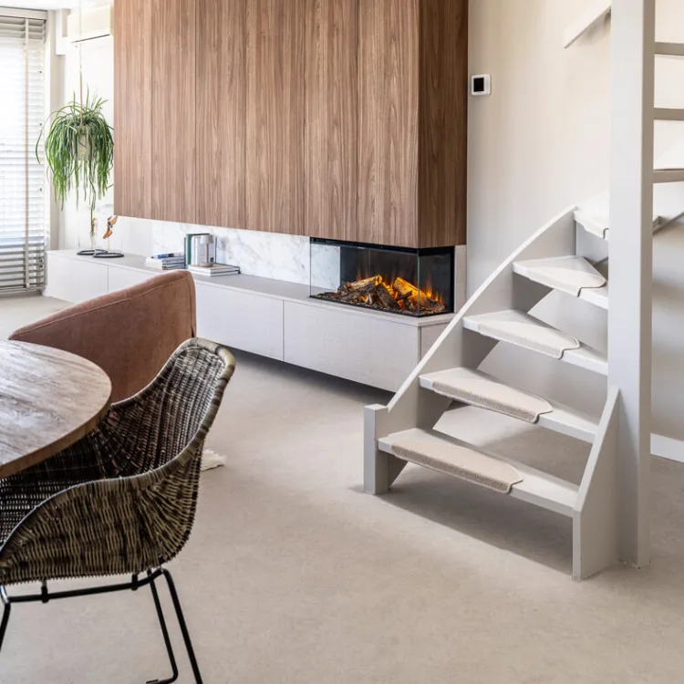 Frans heeft gekozen voor een Cinewall op maat van Allure, in de kleuren LS40 Poro Noce en de selected by Frans kleur Soft Linnen. Beide dames zijn namelijk gek op hout en door de toevoeging van de linnenlook ontstaat er niet alleen een speels effect, maar ontstaat er ook meer dynamiek. De elektrische sfeerhaard (New Forest 870) zorgt voor verbinding én warmte: het voegt namelijk niet alleen sfeer toe, maar straalt ook warmte uit - letterlijk en figuurlijk!